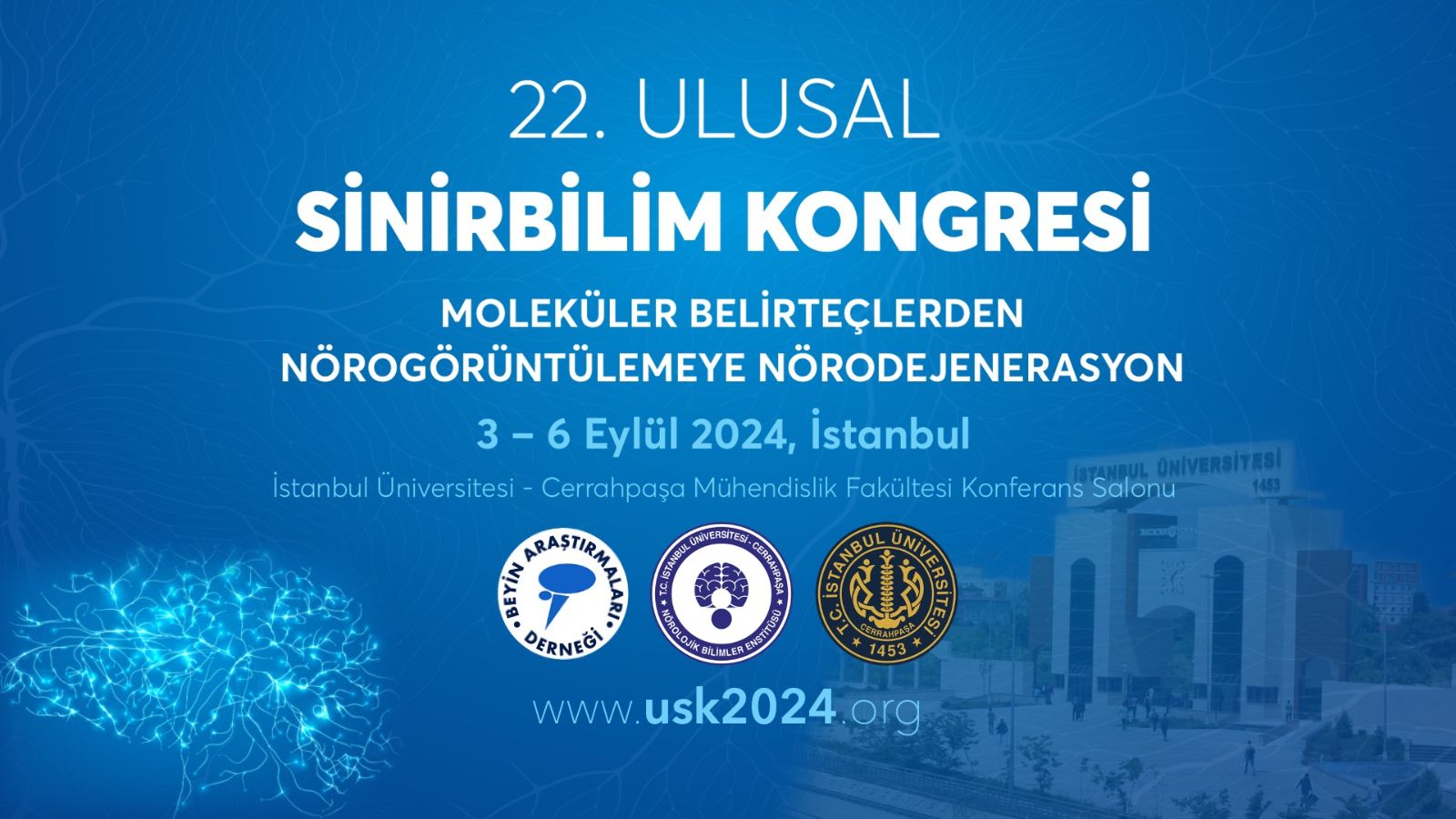 22. Ulusal Sinirbilim Kongresi (USK), İstanbul Üniversitesi-Cerrahpaşa ve Beyin Araştırmaları Derneği (BAD) tarafından İstanbul Üniversitesi-Cerrahpaşa Avcılar yerleşkesinde 3-6 Eylül 2024 tarihleri arasında gerçekleştirilecektir.