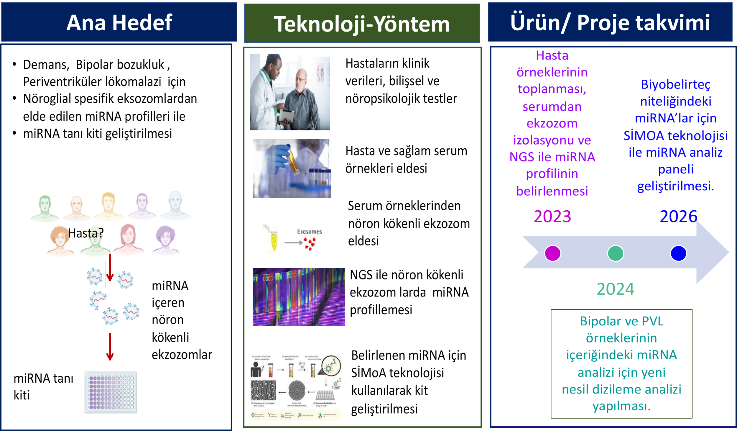 Eksozomlar, çapları 40-100 nm olan keseciklerdir ve kargo içeriklerinde mRNA, miRNA ve diğer kodlamayan RNA’ları ve protein, lipid gibi molekülleri taşıdıkları bilinmektedir. Eksozomlar hücrelerden hem normal hem de patolojik koşullarda salınırlar. Eksozomların içerdikleri farklı türde moleküller nedeniyle birçok hastalık için biyobelirteç olma potansiyeli taşımaktadırlar. MikroRNA’lar (miRNAlar), post-transkripsiyon ve translasyon düzeyinde düzenleme mekanizmasının aracıları olan moleküllerdir. Yapılan çalışmalarda şizofreni, depresyon, anksiyete gibi pek çok psikiyatrik hastalıkta miRNA profillerinde değişiklik saptanmıştır. Bu bakımdan nöronal hastalıklarda nöroglial spesifik eksozomların incelenmesi hastalık tanı ve patolojisi bakımından oldukça önemli olup nöroglial eksozomal miRNA içeriğinin potansiyel biyobelirteç olarak belirlenebilmesi hastalık tanısı ve tedavisinde kullanılabilmeleri adına önemlidir.Projede:
