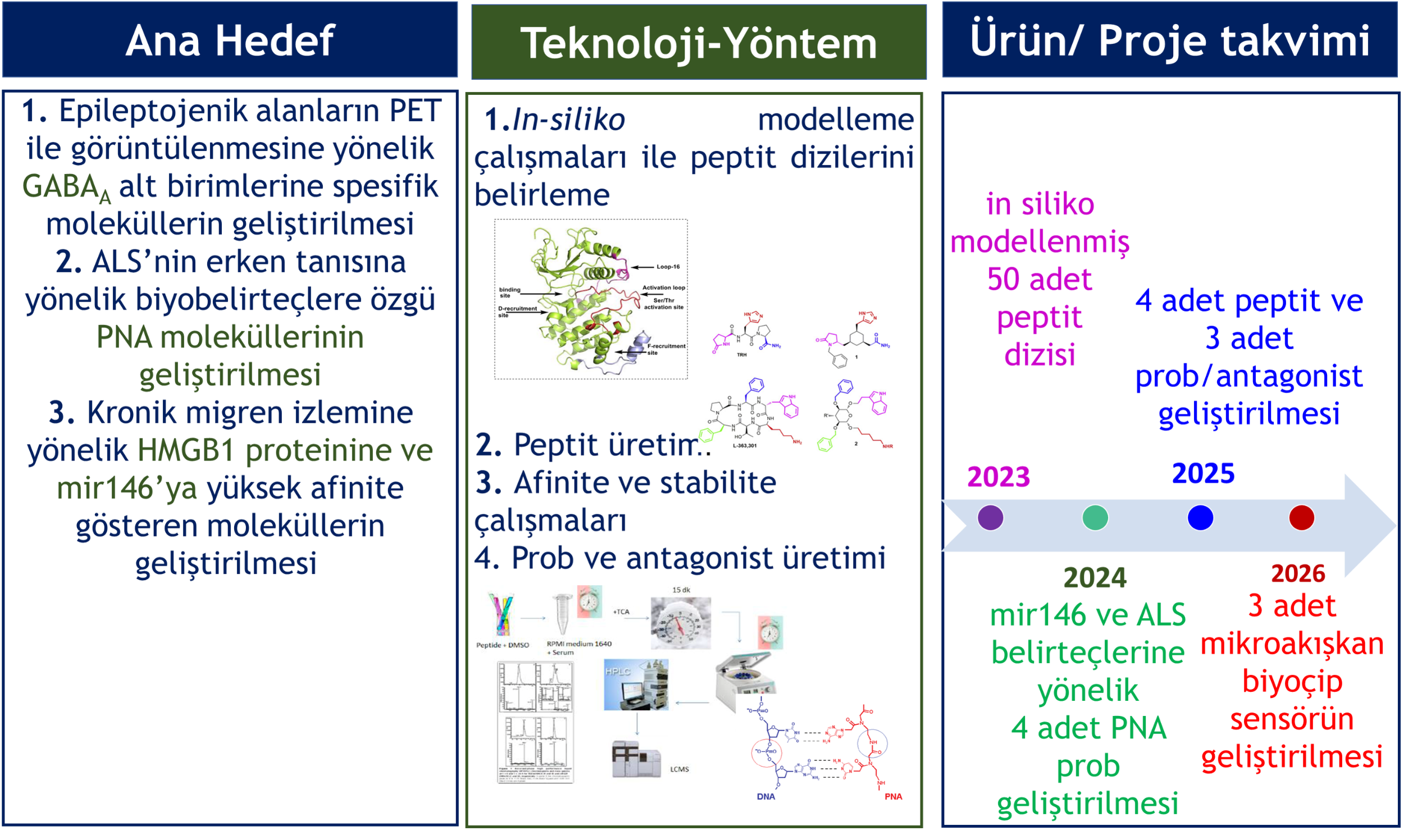 Nörodejeneratif hastalıklar, sinir hücrelerinin zamanla kaybına ve sinir sisteminin işlevlerindeki bozulmalara yol açan bir grup hastalığı tanımlar. Bu hastalıklar, genellikle ilerleyici bir seyir gösterir ve bireylerin yaşam kalitesini ciddi şekilde etkiler. Nörodejeneratif hastalıkların teşhisi genellikle klinik gözlem, görüntüleme testleri ve bazı belirli biyobelirteçlerin ölçümünü içerir. Ancak, bu hastalıkların erken teşhisi ve izlenmesi için daha etkili belirteçlerin geliştirilmesi büyük önem taşır. Yeni teşhis moleküllerinin keşfi, hastalıkların daha erken aşamalarda tanınmasına ve tedaviye daha erken müdahale edilmesine olanak tanır. Bu, hastaların yaşam kalitesini artırır ve hastalıkların ilerlemesini yavaşlatabilir. Projede, epilepsi, ALS gibi nörodejeneratif hastalıkların yanı sıra migren gibi nörolojik rahatsızlıklar için seçilen biyobelirteçlere spesifik yüksek afinite gösteren moleküllerin ve epilepside GABAA alt reseptörlerindeki benzodiazepin bölgelerine yönelik afinite gösteren moleküllerin geliştirilmesi amaçlanmaktadır. Bu proje çalışmasında nörodejeneratif hastalıklarla ilgili yeni teşhis ve tedavi moleküllerinin geliştirilmesi için yenilikçi ve çok disiplinli bir araştırma yürütülecektir. Projede: