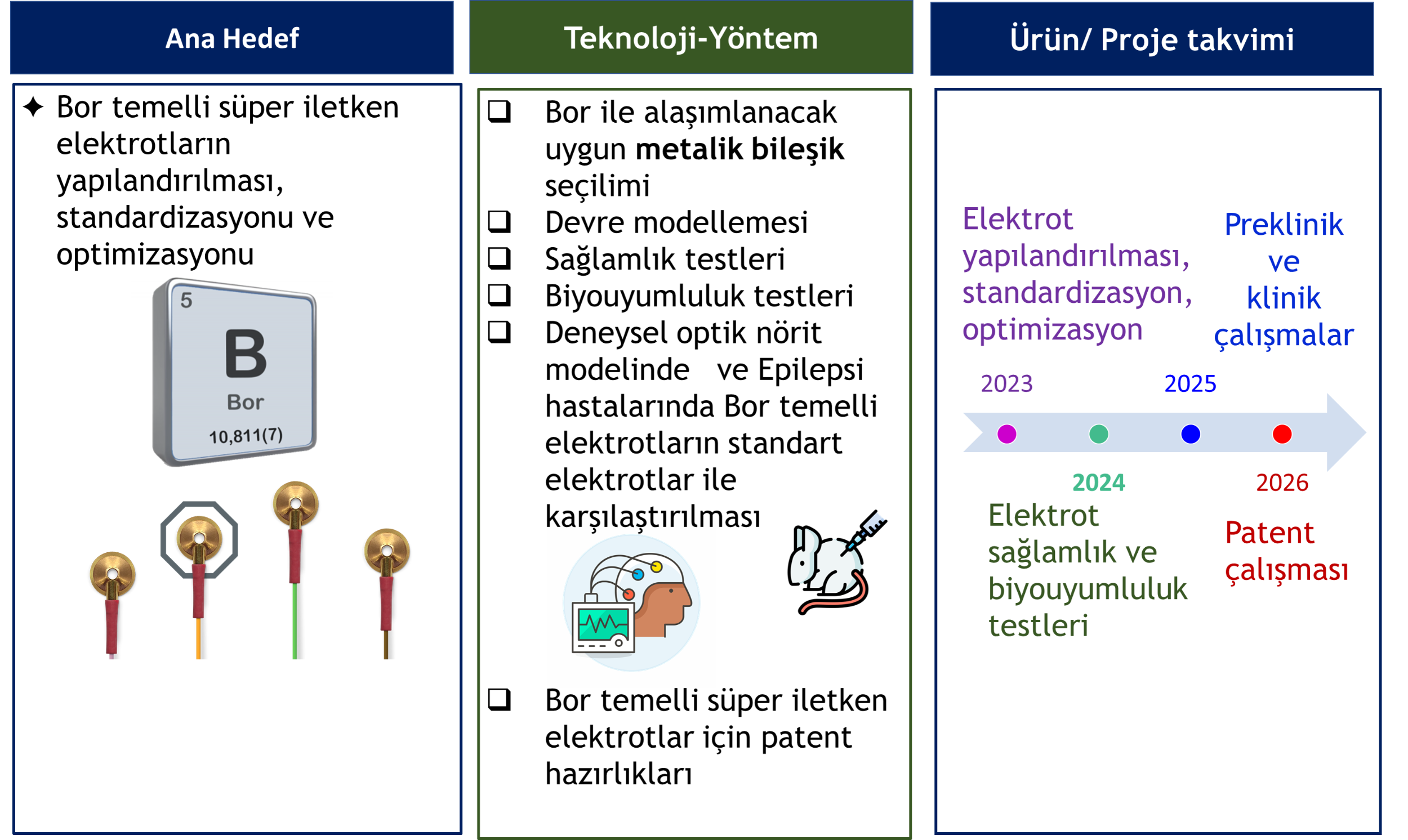 Elektrofizyolojik ölçümler hücrede, dokuda, organda veya tüm organizmada invaziv veya non invaziv yöntemlerle yapılmaktadır. Elektrotlar vücuttan potansiyellerin kaydedilmesinde ya da vücut hücrelerinin uyarılmasında önemlidir. Süper iletkenlik özelliği taşımayan altın, gümüş, platin, çinko, bakır gibi metaller ile yapılan elektrotlar normal bir iletkenliğe sahiptir. Bu metal elementlerde gerçekleşen elektrik akımını oluşturan iyonlar belirli bir patern içerisinde hareket eder ve elektronlar birbirleri ile çarpışırlar. Bu çarpışmalar sırasında taşınan elektrik akımında enerji kaybedilir. Süper iletkenlik özelliği taşıyan metal elementlerde ise fiziksel özellikleri nedeni ile elektron çarpışması gerçekleşmediği için iyon kaybı olmaz ve temelde enerji korunumu meydana gelir. İletilecek olan elektrik akımı hiçbir şekilde enerji kaybetmeden ilerler. Pek çok fizyolojik ve nörofizyolojik non-invaziv kayıtlarda kullanmak üzere geliştireceğimiz mükemmel elektrotlarda yüksek süper iletken özelliğe ve düşük dirence sahip olan bor ve bor bileşenlerini seçmemizin en temel amacı; ilgili vücut alanından elde edilecek kayıtların empedanslarının düşük olması ve en küçük lokal elektriksel değişiklikleri dahi algılayabilmesine dayanmaktadır. Bu projede: