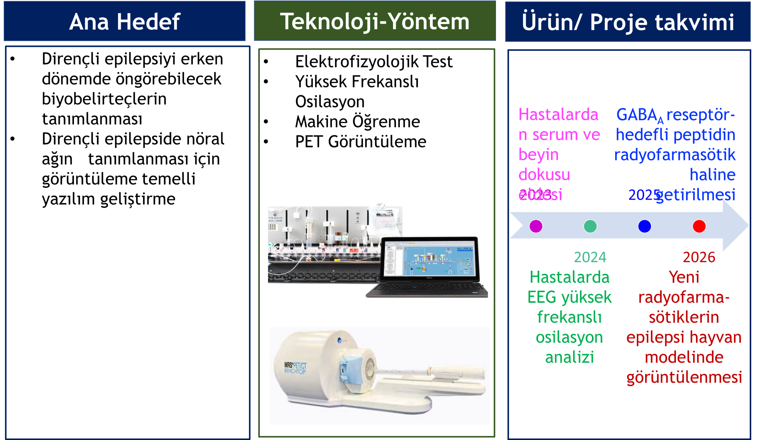 Epilepsi; beynin nöbet geçirme potansiyeli ile karakterize olan ve nörobiyolojik, kognitif, psikolojik ve sosyal sonuçlar doğuran bir hastalıktır. Uygun nöbet önleyici ilaçların yeterli dozda ve yeterli sürede verilmesine karşın nöbetlerin devam etmesi durumunda ilaca dirençli epilepsi (refrakter, farmakorezistan, intraktabl) varlığından söz edilir. Son on yıl içinde birçok farklı mekanizma üzerinden etki eden yeni nöbet önleyici ilaçların kullanılmasına rağmen, yeni tanı alan epilepsili bireylerde tedavi başarısı oranının değişmediği görülmüştür. Bu büyük hasta grubunu oluşturan kişiler için dirençli epilepsi hem sosyal hem de medikal olarak engelliliğe sebebiyet vermektedir. Dirençli epilepsili bireyler toplumda aktif olarak yer alamamakta, okul ve iş hayatlarını idame ettirememektedir. Bugün elimizde olan veriler ile yeni tanı almış bir epilepsi hastasında dirençliliği ön görecek bir biyobelirteç veya görüntüleme yöntemi bulunmamaktadır. Bu çalışmamızda amacımız, epilepsi hastalarında dirençliliği ön görecek biyolojik, elektrofizyolojik ve nörogörüntüleme yöntemlerini geliştirmektir. Epilepside dirençliliği öngörme amaçlı tanısal yöntemlerin geliştirilmesi ile bu hastaların erken safhada tanınarak etkin tedaviye gecikmeden başlanması ve kişilerin yaşam kalitelerinin artırılarak toplumda etkin ve sağlıklı bir birey olarak yer alabilmelerinin sağlanması hedeflenmektedir. Bu projede;
